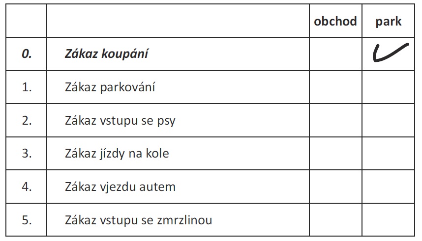4. Vyberte z nabídky, který zákaz můžete vidět obvykle před obchodem nebo před parkem. Úkol číslo 0 je příklad. Někde můžete mít dvě řešení.