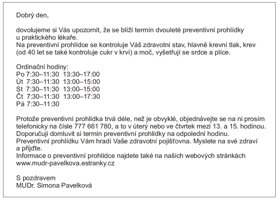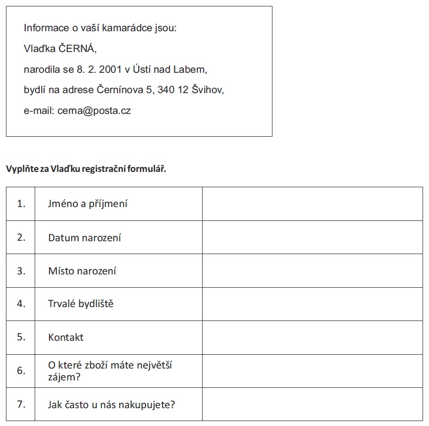 1. Vaše kamarádka Vlaďka si zlomila ruku. V obchodě s drogerií jí nabídli slevu, když bude mít kartuzákazníka. Chce kartu, ale musí se zaregistrovat. Protože nemůže psát, poprosila vás, abyste vyplnil/a  kartu za ni.