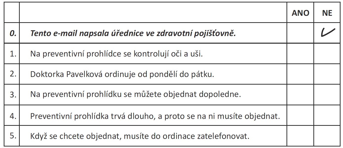 5 Přečtěte si e-mail a rozhodněte, která informace je pravdivá (ANO) a která nepravdivá (NE). Úkol číslo 0 je příklad.
