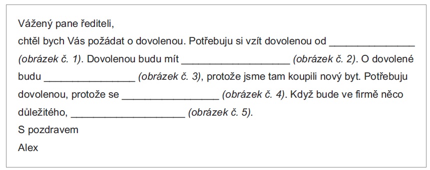 2 Chcete si vzít v práci dovolenou, o kterou musíte písemně požádat. Doplňte informace do e-mailu podle obrázků.