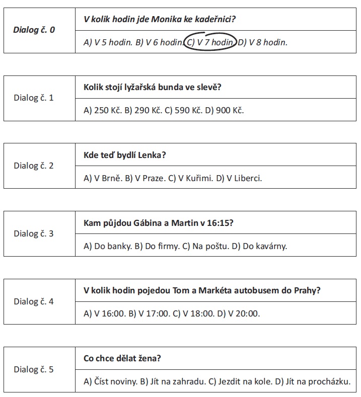 1. Poslechněte si dialog. Pak vyberte jedno správné řešení. Dialogy uslyšíte 2x. Dialog číslo 0 je příklad. Dialog číslo 0 uslyšíte jen 1x.