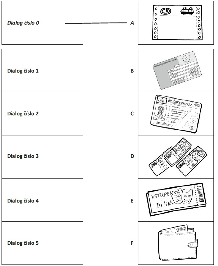 2. Poslechněte si dialog a spojte důležité slovo v dialogu a obrázek. Dialogy uslyšíte 2x. Dialog číslo 0 a obrázek A jsou příklad. Dialog číslo 0 uslyšíte jen 1x.