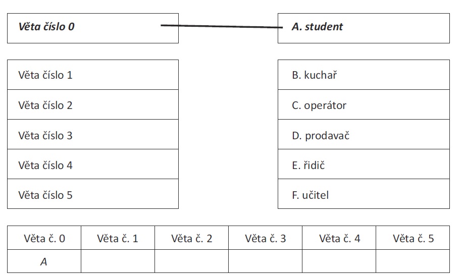3. Poslechněte si věty a spojte větu a povolání. Věty uslyšíte 2x. Věta číslo 0 a slovo A jsou příklad.
