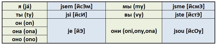 Já jsem Petr, я Пётр stůl je bílý, стол белый my jsme doma, мы дома oni jsou cizinci, Они иностранцы Ty jsi doma? Ты дома? Kdo je to?Кто это?
