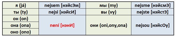 Мы уже знаем, какие формы у глагола "být" (jsem, jsi, je, jsme, jste, jsou). А если нужно сделать отрицание? Как быть, если "не быть"? Добавляем частицу "ne" перед нужной формой, за одним единственным исключением.