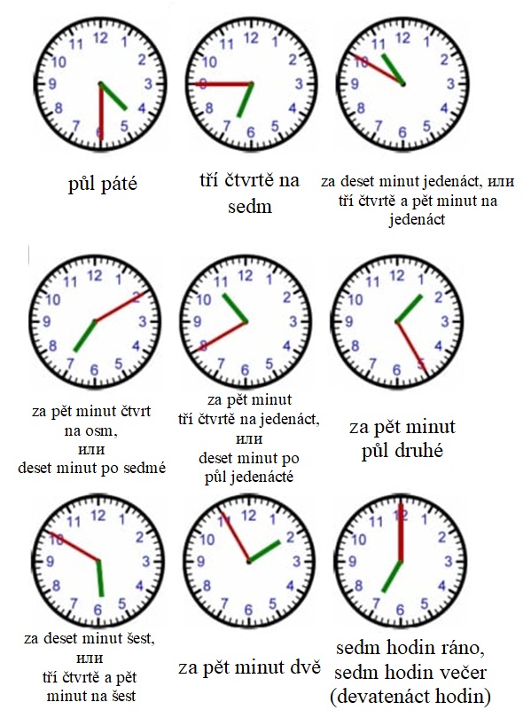 Можно конечно же и называть время в прямым соответствием с часами и минутами (dvanáct třicet pět, например). Но приготовьтесь к тому, что каждое второе время будет называться с использованием "четверти, половины, трех четвертей за, после и тд.), это довольно популярная практика. И чтобы не попасть с этим вопросом впросак - лучше разобраться в обозначении времени в таком "ретро-стиле".