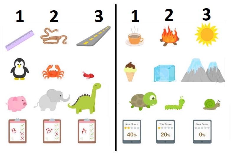 Сравним картинки между собой. Нужно завать каждый предмет, сравнив его с другим. Если не знаем словао, тогда можно его заменить на номер. Например, číslo jedna je kratší než číslo dva, číslo tři je nejkrátší ну и так далее.