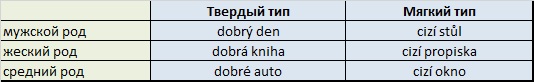 Кой-какие слова-существительные мы уже знаем. Теперь настало время приложить усилия к прилагательным. В чешском языке они бывают 2х типов - твердого (с существительным именительного падежа мужского рода они заканчиваются на -ý) и мягкого типа (с существительными всех родов в именительном падеже они имеют окончание -í). Суть в том, что как и в русском языке, прилагательное согласуется с родом существительного через окончания. Вот посмотрите на табличку.