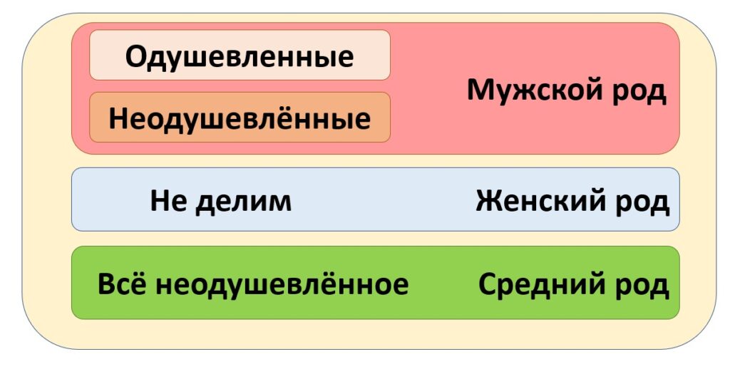 Начнём с одушевлённых существительных мужского рода (верхний ряд)