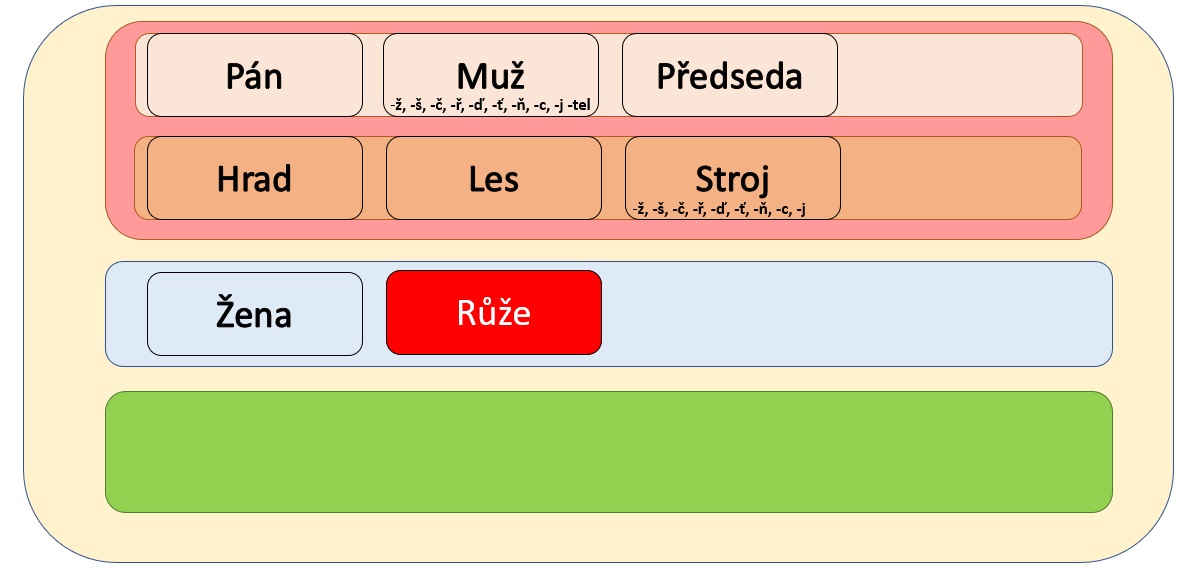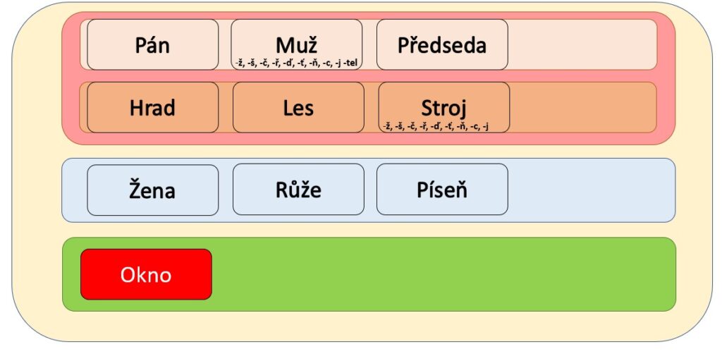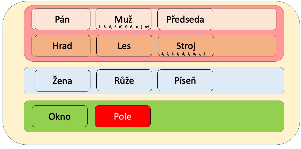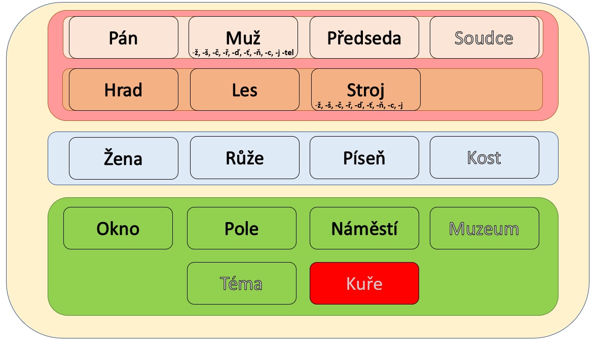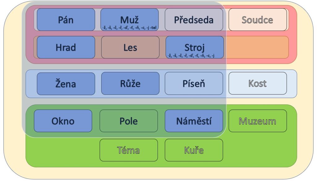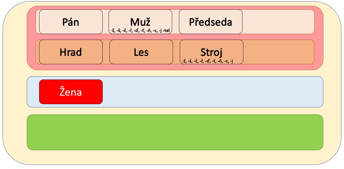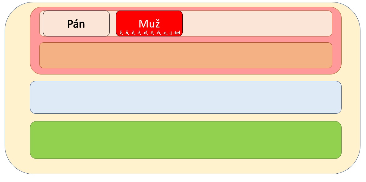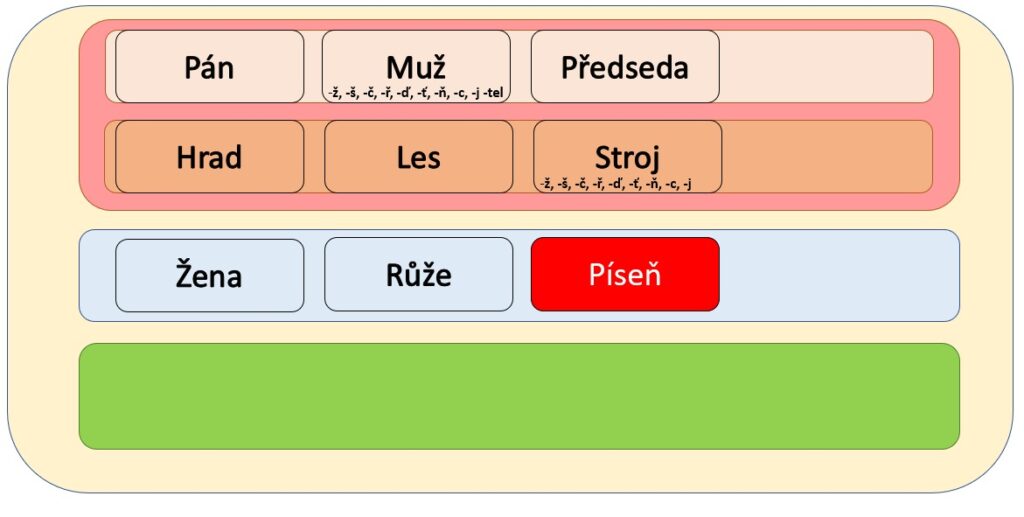 Слова будем группировать по классам. Каждый класс слов будет иметь свои окончания в падежах и множественном числе. Поэтому удобно их группировать по этому принципу. Поэтому для того, чтобы правильно поставить слово в какой-то падеж, нам нужно быстро и правильно выполнить 2 задачи. Первая - уметь относить слово к определенному классу и вторая -  запомнить окончания в каждом классе, а для этого в дальнейшем будем приводить эти окончания на названии класса (pán, muž, píseň и так далее)