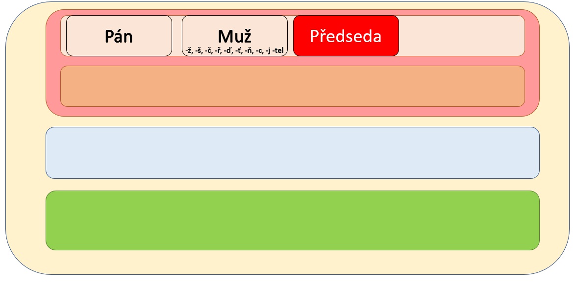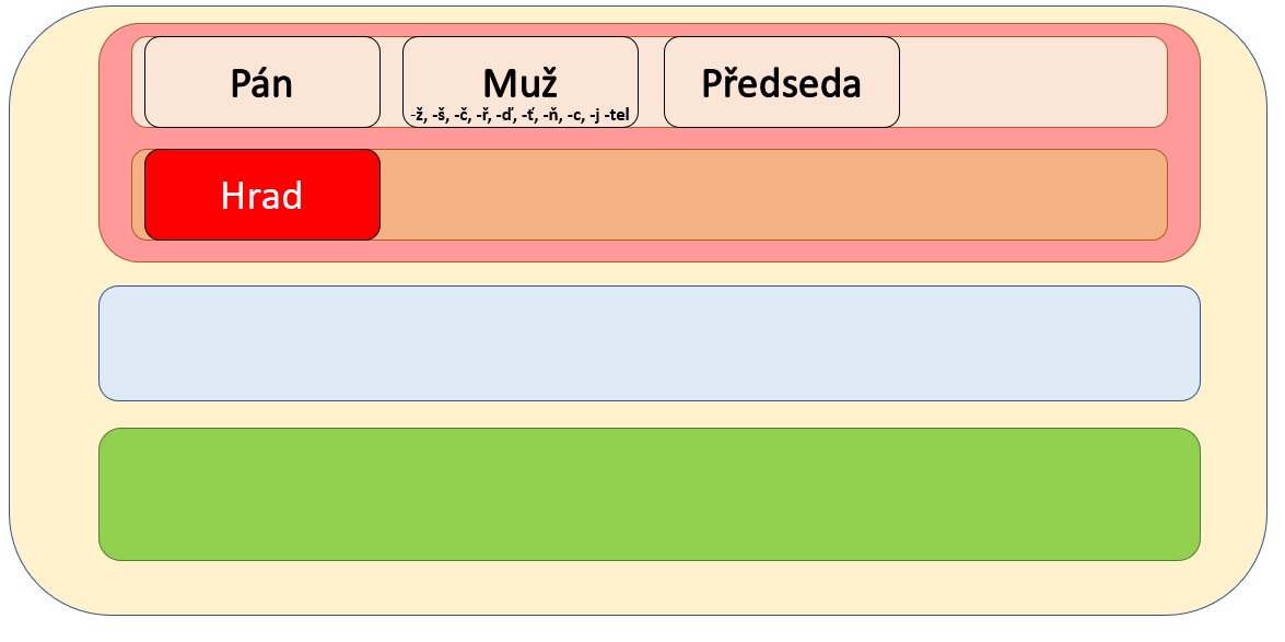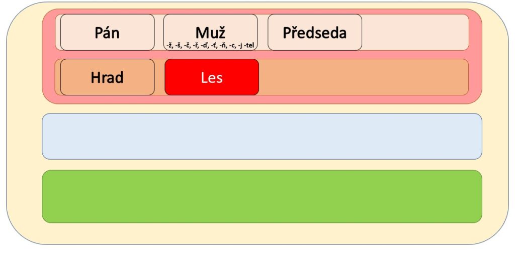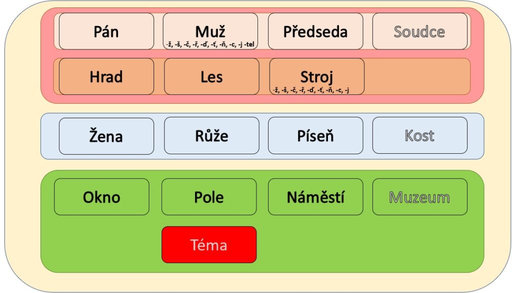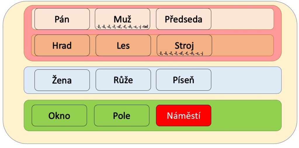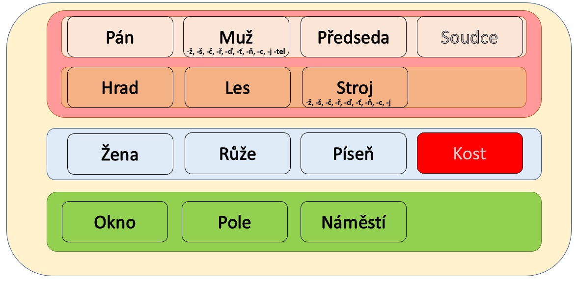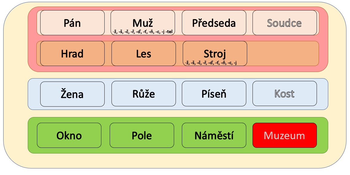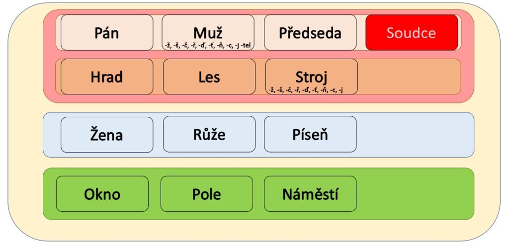 Слова будем группировать по классам. Каждый класс слов будет иметь свои окончания в падежах и множественном числе. Поэтому удобно их группировать по этому принципу. Поэтому для того, чтобы правильно поставить слово в какой-то падеж, нам нужно быстро и правильно выполнить 2 задачи. Первая - уметь относить слово к определенному классу и вторая -  запомнить окончания в каждом классе, а для этого в дальнейшем будем приводить эти окончания на названии класса (pán, muž, píseň и так далее)