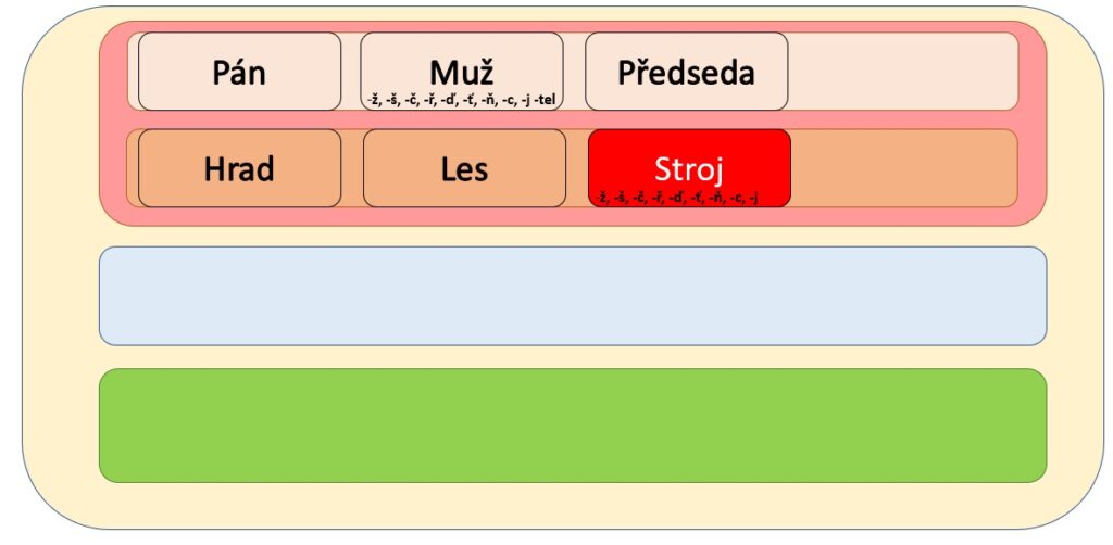 К этому классу будут относиться неживые существительные мужского рода, которые будут заканчиваться на мягкую (ž, ř, š, c, č, j, ď, ť, ň ) согласную. Принцип такой же, как и у слов типа muž, только неодушевлённые существительные: