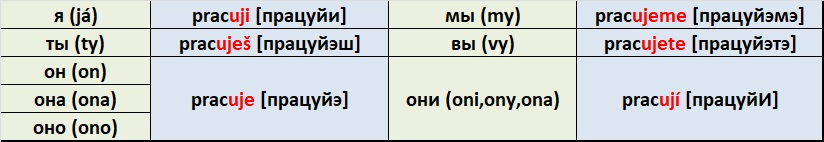 При спряжении, суффикс –ovat отбрасывается, и вместо него добавляются суффиксы –uji, -uješ, -ují, -ujete, -ujeme, -ujístudovat, pracovat, potřebovat, tancovat ...