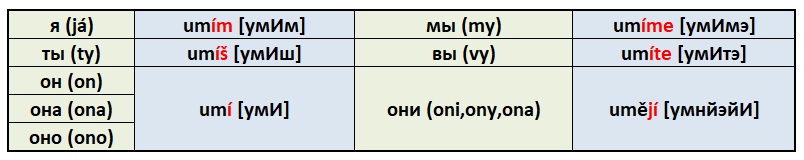 Как можно заметить, окончания глаголов на -it и на -et/ět будут одинаковыми, за исключением 3 лица множественного числа (oni). У некоторых (но не у всех!) глаголов на -ět, как раз в случае глагола umět, будет окончание -ějí, у большинства же будет окончание -jí (совпадает с единственным числом: on vidí - oni vidí, on slyší - oni slyší atd.)