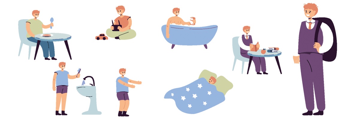 - Мария: Я встаю в 6:30 утра. Затем я умываю лицо, завтракаю, надеваю одежду и делаю макияж. Мне нужно выходить в 7:30, потому что я не смею опоздать.
