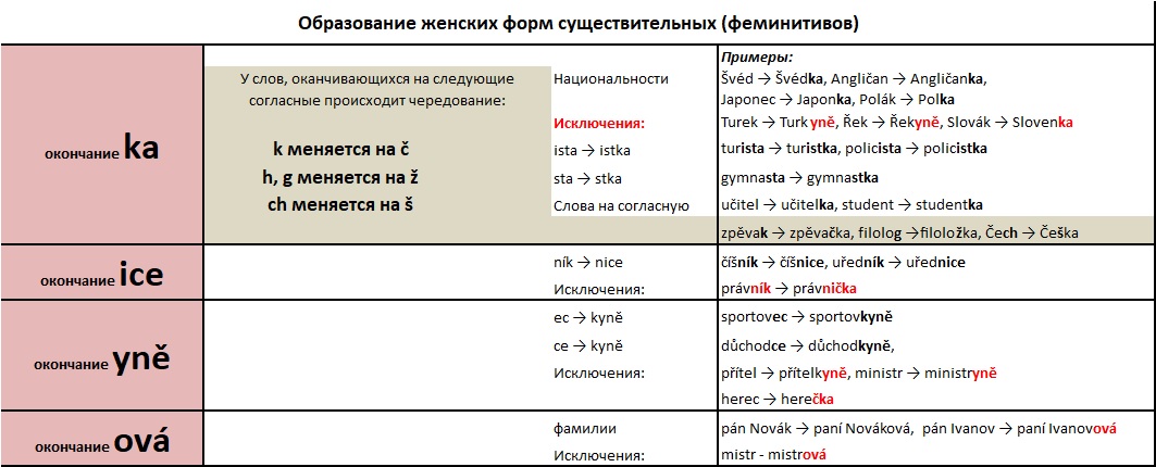 В чешском языке образование женских эквивалентов (феминитивов) профессий, национальностей и тд. в целом распространено более широко, чем в русском языке. Грамматически это делается с помощью окончаний -ka (самый частый случай), -ice, -yně, -ová. См. таблицу.