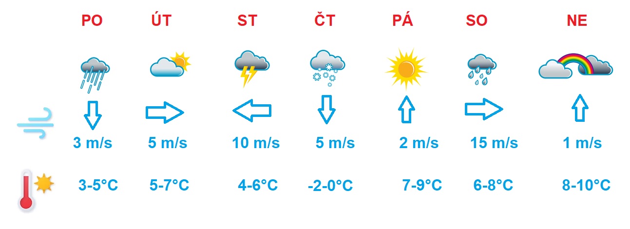 1. Napíšte předpověď počasí na příští víkend v ČR. Jaká bude teplota, vítr, vlhkost atd. Bude zataženo nebo jasno? (minimálně 20 vět).