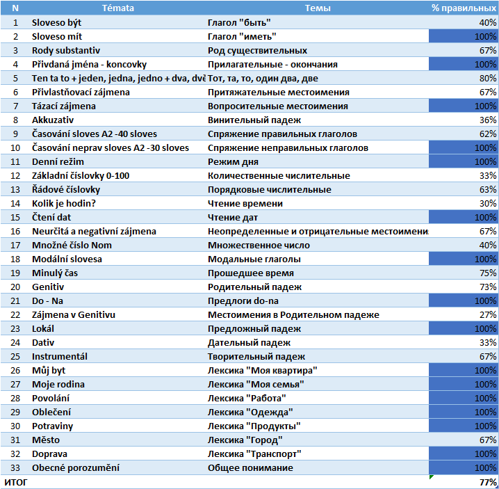 | 6 | GA2-1 | Глагол být. Общая лексика А2 | 100 правильных, 20 ошибок макс | 100 | 3 | сдано |