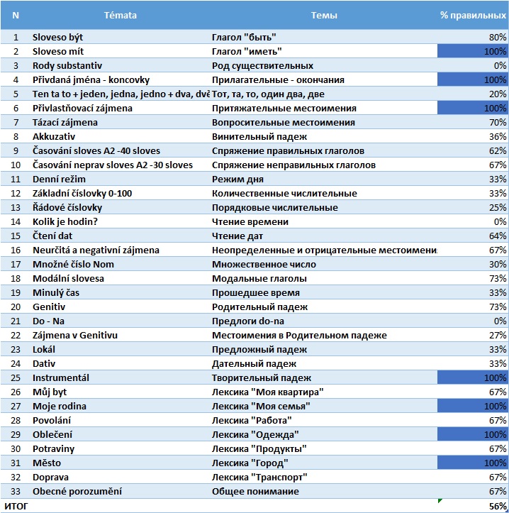 | 2025-01-26 | GA2-4 | ten/ta/to + jeden/jedna/jedno, + dva/dvě. Общая лексика А2 | 100 |