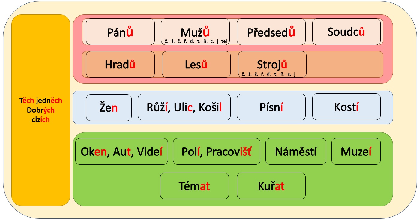 В мужском роде добавляется одно окончание - ů (соответствует окончанию "ов" или "ев" в русском языке) в. Классы слов žena и okno будут отбрасывать окончания -a -o соответственно с добавлением буквы e в том случае, если в корне на стыке корня и окончания присутствует 2 согласные буквы: okno - oken. К классам слов růže, píseň, kost добавляются окончани -í, однако здесь существует 2 исключения. Если слово из класса růže заканчивается на -ice (рус: -ица), -ile, то Родительный падеж будет образовываться простым отбрасыванием окончания -e: ulice - ulic, košile - košil. У класса okno среди вышеупомянутого отбрасывания -o и добавления (или не добавления) -e, существует ряд исключений. Сюда относятся слова с окончанием из двух гласных, например -eo. В этом случае вместо -о мы добавляем окончание í. Это же окончание будет и у класса muzeum (как всегда при этом отбрасываем -um) а также класса pole. Однако, здесь тоже есть ряд исключений, слова на -iště будут образовывать Родительный падеж множественного числа отбрасыванием ě (при этом остается - išť. Например pole - polí, однако pracoviště - pracovišť. К классам слов téma и kuře добавляются окончание -at. Хорошая новость заключается в том, что во всех родах у указательных местоимений ten/jeden используется окончание -ěch а у прилагательных твёрдого типа используется окончание - ých, мягкого типа - ích.