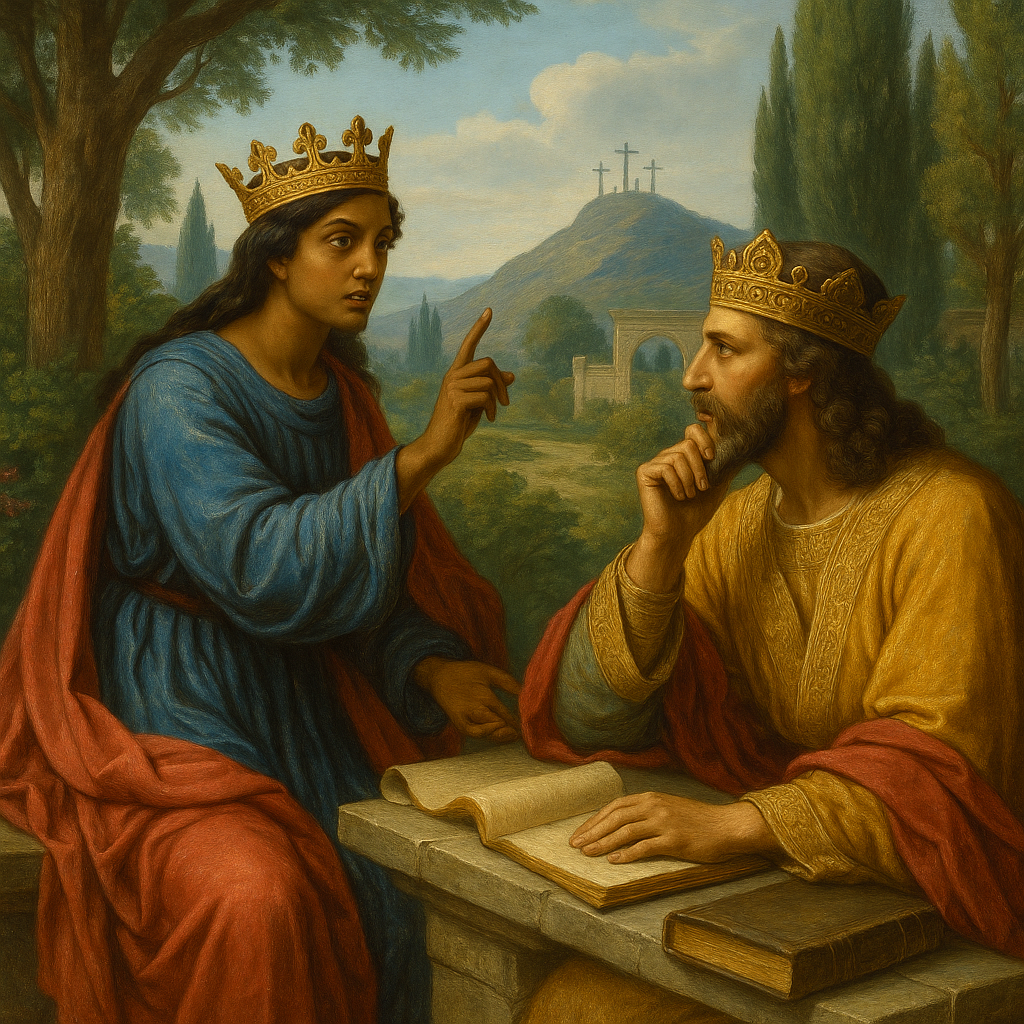 Jemuž odpověděla Sibylla: „Králi, toho povědomost nemám, neboť toho neoznámil Bůh ani svým andělům. Ale řeknu ti, králi: Máš služebníky, dobré a zlé. Dáváš-li zlému tolik jako dobrému?“ „Dobrý měj se dobře, zlý budiž potrestán,“ odvětil král.