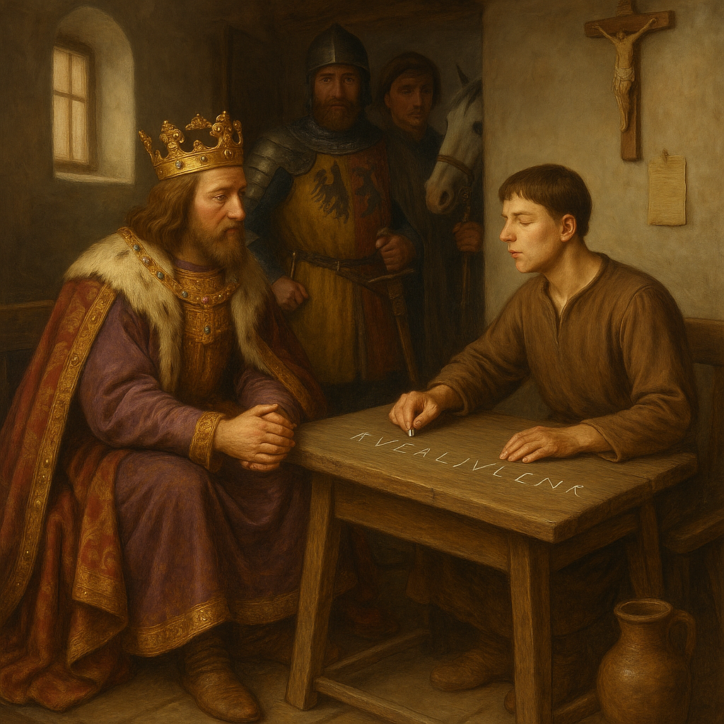 tak učinil a rozmlouval se slepým mládencem o různých věcech, až pak řekl: „Milý mládenče, soudím, že pro to Bůh zbavil tvé oči světla, abys viděl do tmavé budoucnosti. Pročež pověz, cos dříve napověděl: jak bude s mou vlastí, jak dlouho ještě potrvá toto mé království v slávě?“ Mládenec ani slova nepromluvil, ale vzav křídu napsal tyto litery na stůl, jednu od druhé podále, a to: K. V. Z. A. L. J. V. L. F. M. R.
