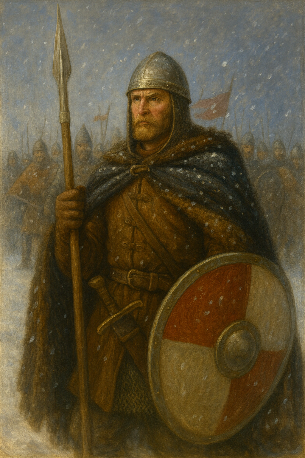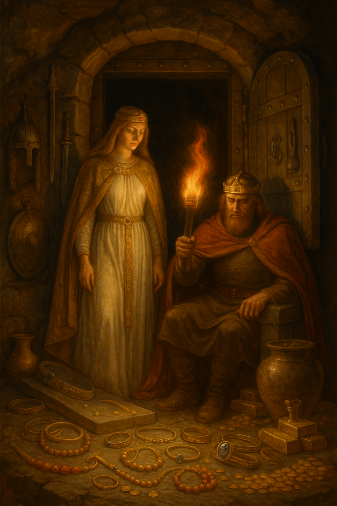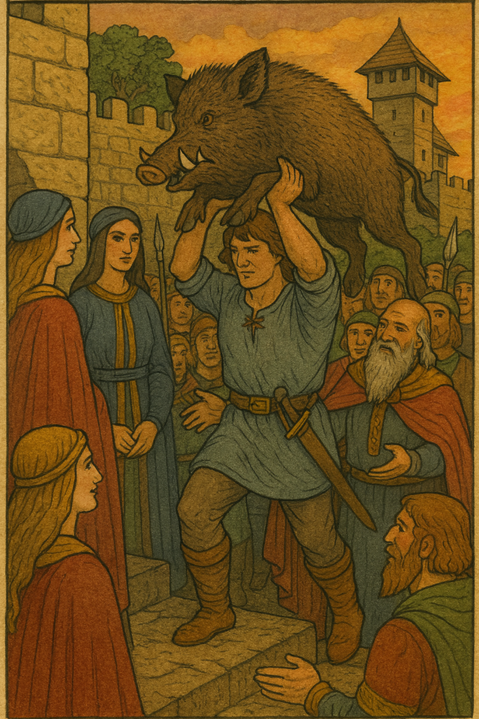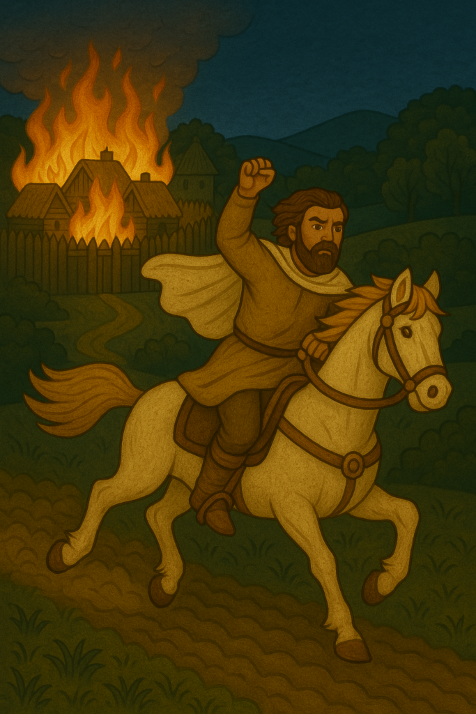 Rudá jeho zář míhala se po stěnách, kde visely štíty tmavými kožemi potažené, tenata, luky, dřevěné toulce v jezevčině, nedlouhý meč, mohutný oštěp i těžký, kamenný mlat, kde parohy jelenů i zubří rohy vrhaly po stěnách křivolaké stíny.