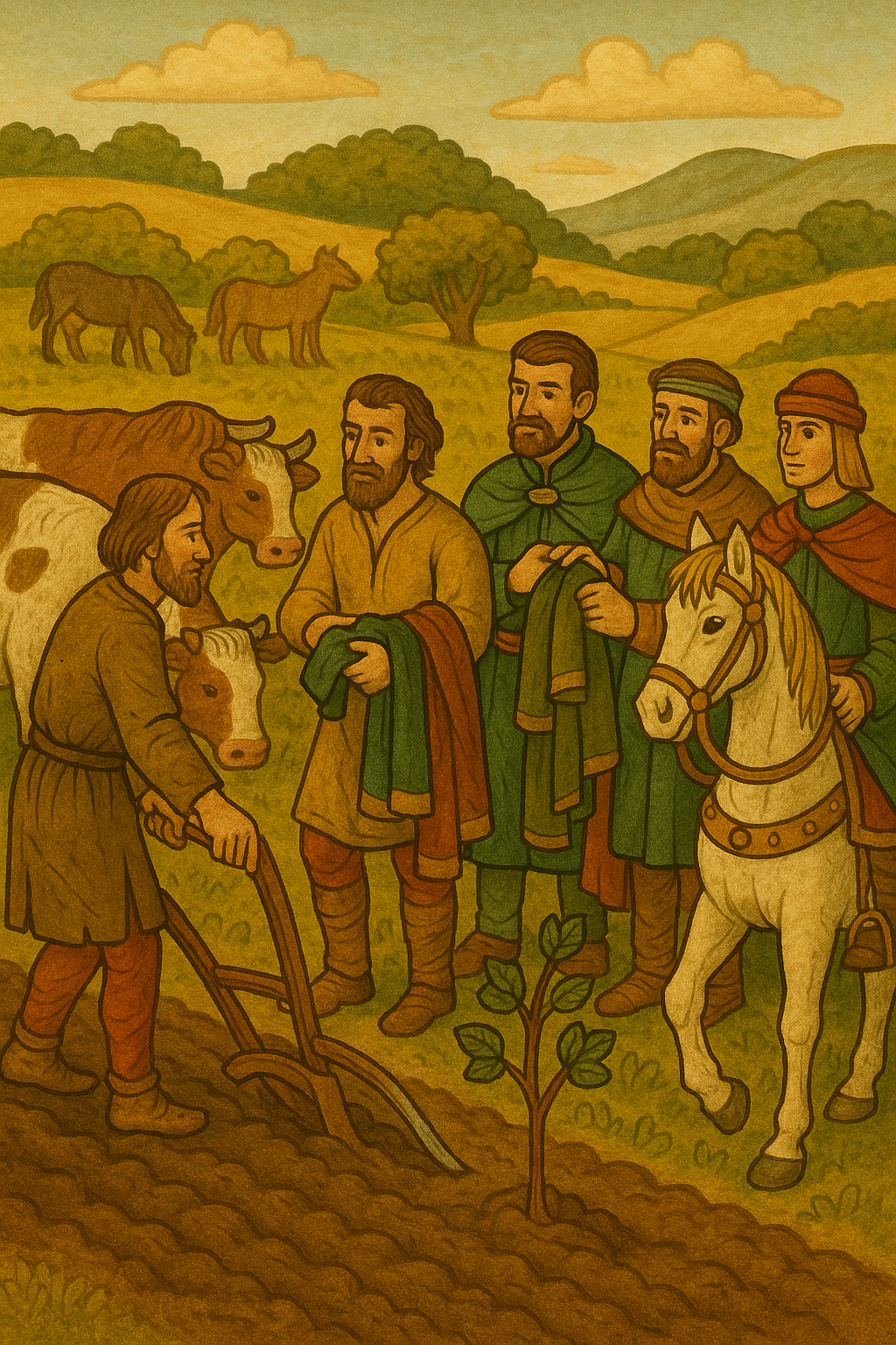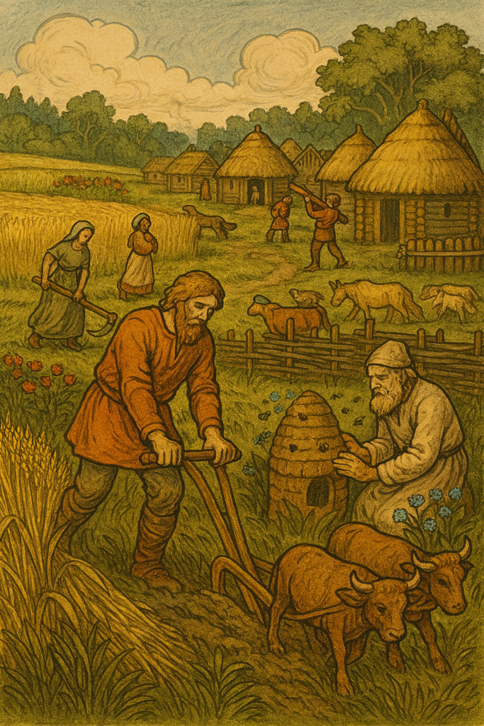 Stavení s chlévy a stáji, s kolnami a humny za nimi v ohradě plotů spletených z proutí nebo sroubených z trámů, stavěli kolem okrouhlé návsi. Co rok přibývalo kolem osad polí a co rok půda vydávala hojnější žeň. Žito, pšenice, ječmen, oves i proso hustě se vlnily širými lány; nad ně jasněji se zelenaly pruhy hebkého lnu i vysoké konopí vedle záhonů plných strakatých, makových květů.