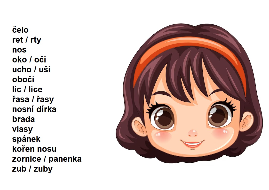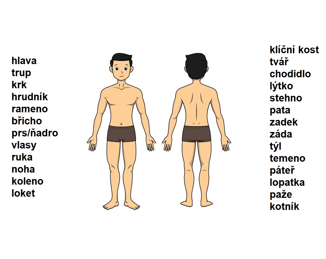 Na ruce jsou prsty: malíček, prsteníček, prostředníček, ukazováček, palec, zápěstí a dlaň